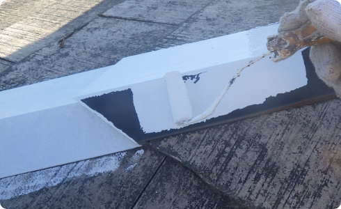 下塗り材を用いて塗料と屋根材の密着性を高めます。