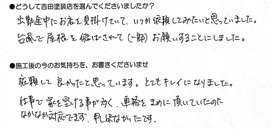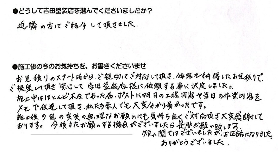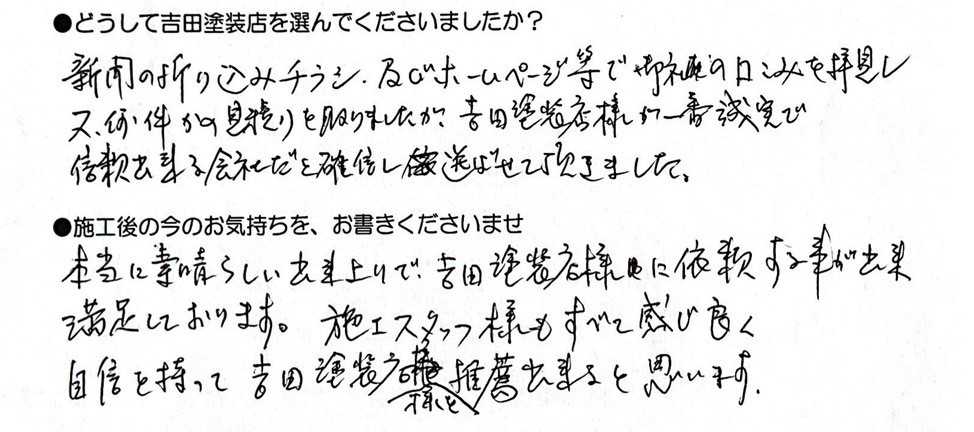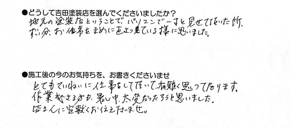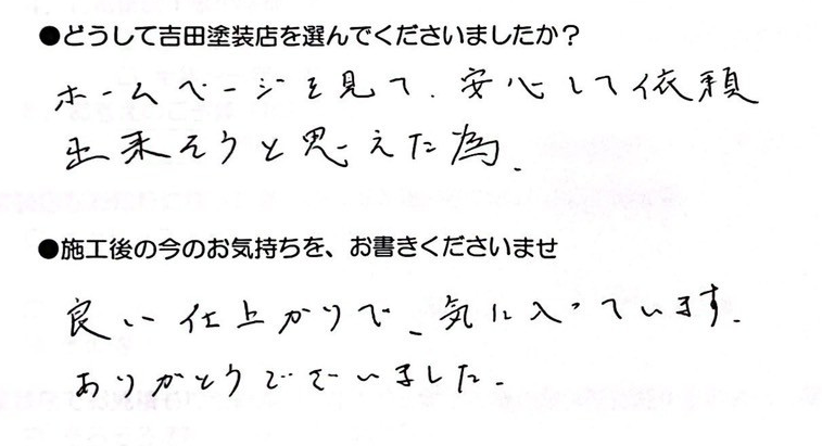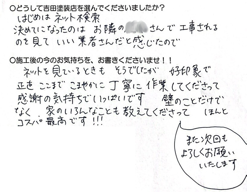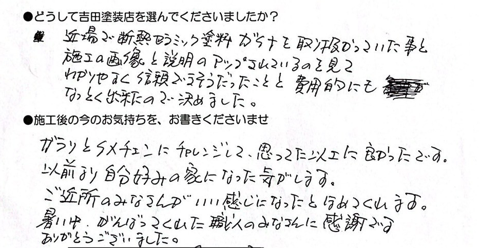 実際に当社のサービスをご利用いただいたお客様からの声をご紹介しております。施工の仕上がりや対応の丁寧さなど、多くの喜びの声を頂戴しております。これらの声は、私たちの励みであり、さらなるサービス向上への糧となっております。お客様の生の声をぜひご覧いただき、当社の強みや特徴を感じていただければ幸いです。
