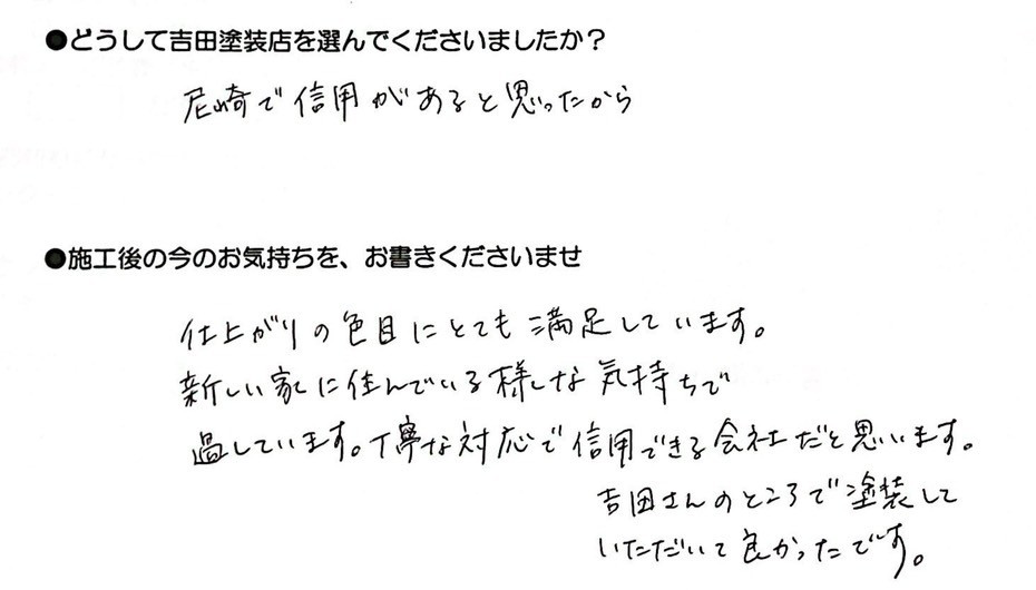 - 仕上がりの色目にとても満足しています。 新しい家に住んでいる様な気持ちで過しています。丁寧な対応で信用できる会社だと思います。吉田さんのところで塗装していただいて良かったです。